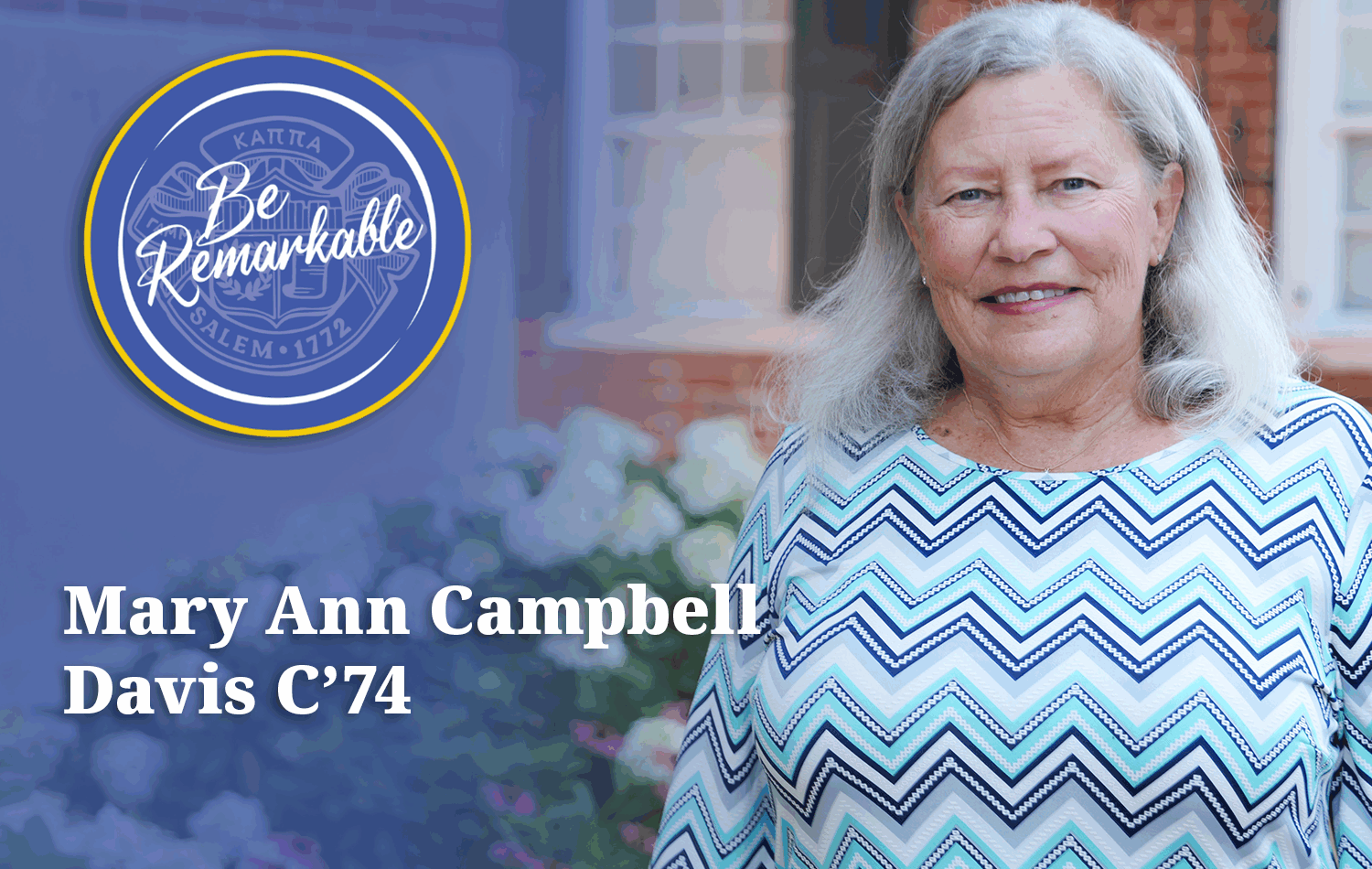 For over 50 years, Mary Ann Campbell Davis has exemplified what it means to “Be Remarkable” as a member of the Salem Academy and College community. She first learned about Salem College at her high school in Laurinburg, NC, while working in the guidance counselor’s office, where she organized college catalogs and came across Salem’s catalog. As soon as she looked through the catalog, Mary Ann knew Salem College was the place for her.